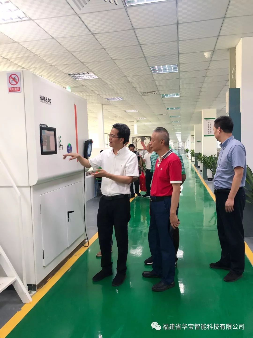 福建華閩集團劉平山董事長、王志明副董事長、池徳庭常務(wù)副總、張靚董事長助理、林玉明業(yè)務(wù)部經(jīng)理、技術(shù)人員張平山一行對華寶科技休閑鞋智能化成型生產(chǎn)線硫化工藝產(chǎn)線以及冷粘工藝產(chǎn)線進行參觀,同時也對華寶科技致力于鞋業(yè)的自動化控制和鞋業(yè)機械的相關(guān)產(chǎn)品的研 發(fā)、生產(chǎn)和銷售表示支持與肯定!