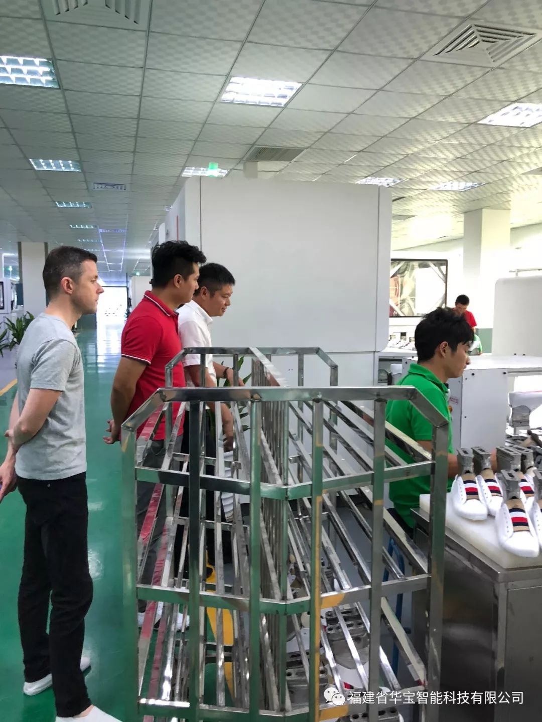 Vaughan和Gavin在負責人陪同下參觀制鞋智能應用車間